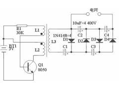 ,由两节五号电池供电。由L1,L2和Q1组成自激振荡器,经变压器升压后,再倍压整流。得到约1500V的高电压。 在制作时变压器可用开关电源变压器的铁芯和骨架,线圈重新绕制,L3用0.1MM的铜丝绕2000匝,最好每层用绝缘纸隔开。L2用0.3MM的铜丝绕20匝,L1用0.3 .. [