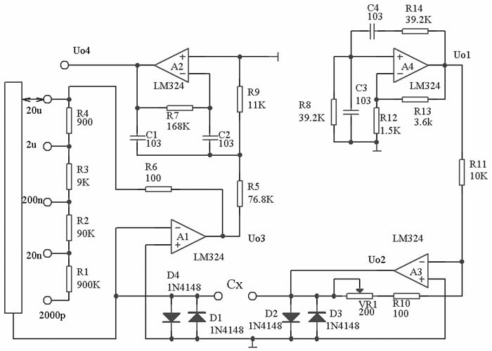 第四部分以A2为中心,为一有源带通滤波器,其中心频率为400Hz,用以滤除其它频干扰。最后输出电压Uo4是幅值与被测电容Cx成正比的400Hz交流正弦电压。用可以测量正弦波的仪表,就可以测出其电容。