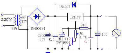 用LM317T制作可调稳压电源,常因电位器接触不良使输出电压升高而烧毁负载。如果增加一只三极管(如下图所示),在正常情况下,T1的基极电位为0,T1截止,对电路无影响;而当W1接触不良时,T1的基极电位上升,当升至0.7V时,T1导通,将LM317T的调整端电压降低,输出电压也降低,从而对负载起到保护作用。如去掉三极管、断开W1中心点连线,3.8V小电珠立刻烧毁,测输出电压高达21V。而加有T1时,小电珠亮度减小,此时LM317T输出电压仅为2V,从而有效的保护了负载。