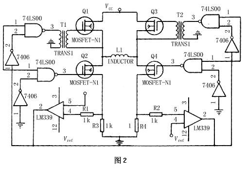 采用耦合变压器驱动VMOS 功率管Q1 和Q3 ,使其不存在静态导通条件。同时用7406 反向器和74LS00 组成逻辑电路提供VMOS 功率管栅极电压,其输出电压为10~15 V ,可以保证VMOS 功率管可靠截止和导通。