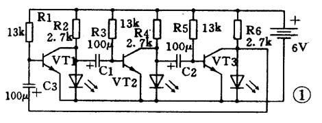 晚间的城市被五彩缤纷的彩灯打扮得十分漂亮,有闪烁的灯,有流动的灯,还有各种霓虹灯。它们大多是由电子电路所控制的。本文介绍的小小循环灯虽然只有三只发光二极管,却可以模拟街头流动的彩灯。它的原理也有广泛的应用。通过制作,同学们可以学到许多知识,提高自己的动手能力。这是一个由三只三极管组成的循环驱动器。它的电路如图1所示。电路是这样工作的;当电源一接通,三只三极管就要争先导通,但由于元器件有差异,只有某一只管子最先导通。假如VTl最先导通,那么VTl集电极电压下降,使电容Cl的左端接近零电压,由于电容器两端的电压不能突变,所以VT2基极也被拉到近似零电压,使VT2截止。VT2集电极为高电压,那么接在它上面的发光二极管就亮了。此刻VT2集电极上的高电压通过电容器C2使VT3基极电压升高,三极管VT3也将迅速导通。因此在这一段时间内,VTl与VT3的集电极均为低电压,只有接在VT2集电极上的发光二极管亮,而其余两只发光二极管不亮。随着电源通过电阻R3对C1的充电,使三极管VT2基极电压逐渐升高,当超过0.6伏时,VT2由截止状态变为导通状态,集电极电压下降,发光二极管熄灭。与此同时三极管VT2集电极电压的下降通过电容器C2的作用使三极管