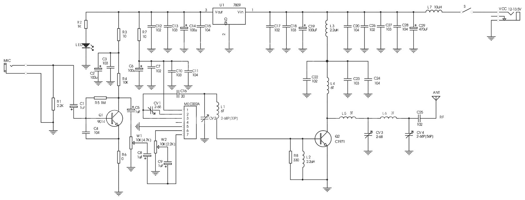 下图是由MEC002A构成的三公里单声道调频发射电路,可以看出,其射频电路实际上只有两级,一级是由MEC002A及周边相关频率控制器件构成的射频振荡输出电路,另一级是由C1971及相关元件组成的丙类射频功率放大器,其它的元件主要是供电和滤波及麦克风放大之用。虽然MEC002A内含麦克风放大电路,但对一些单位而言,需要另外外插麦克风而不使用模块内的高灵敏度麦克风放大电路,为了得到稳定的工作频率,本电路设置了多级电源稳压和滤波电路,其中U1(7809)为MEC002A模块提供稳定的9V电压,C12-C15为电源滤波电容,使工作电压更稳定,以保证MEC002A模块不会因工作电压的改变而产生频率漂移。R3,R7及L3为级间退耦器件,可以有效地克服各级之间因使用同一电源而带来的相互干扰。Q1及其周边器件构成麦克风放大电路,音频输出经C5耦合至W1以控制麦克风的音量大小,受控的麦克风音量经C8耦合至MEC002A的调制端(第7脚),对MEC002A内部高频振荡电路进行调频。MEC002A的第6脚为其内部麦克风音频放大输出脚,经W2控制其声音感应灵敏度后由C9耦合至7脚也对MEC002A内部高频振荡电路进行调频,如欲使MEC002A的内部麦克风不工作,只需将其4脚悬空即可,当需要启动内部麦克风电路时,将4脚接地即可实现。CV1为MEC002A的射频输出频率控制电容,通过改变该电容容量,可使MEC002A的输出频在68-118MHZ范围内变动,基本覆盖了整个校园广播和调频广播频段。但是输出频率的一旦变动,后面一级的射频功率放大器也要跟着调节,才能使射频输出功率最大,发射距离最远。因而建议购买时最好指定所需的工作频率,以便厂家将后级功放电路在所订频点的增益调到最大。MEC002A的第3脚为其射频输出脚,经调制后的调频波由该脚输出经C16,CV2,L1组成的选频网络后送至由Q2(C1971)构成的丙类放大器的基极,MEC002A的1脚为电源供应端,5脚为电源地。Q2工作在丙类状态,偏置电阻为其基极提供负偏压,可使该电路的输出效率比甲类更高些,其前提条件是前级必需要有足够的激励功率,对9V工作电压下的MEC002A来说,其输出功率已近200mW,完全可以推动该丙类放大电路。L5,L6,CV3,CV4构成选频网络,通过调节CV3,CV4可使Q2的输出功率有效地传送给发射天线,整机在12V工作电压下工作电流约为300-700mA,射频输出功率约3W。C30-C33为滤波电容,可减少市电带来的交流纹波。整机工作直流电压为9-13.5V。