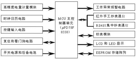 电子式多功能电能表硬件的核心MCU主控制器,它负责按键输入扫描、工作状态检测、计量数据的读入、计算和存储、电表参数的现场配置以及与外界的通信控制等。其主要功能单元包括MCU主控制器单元、电量计量模块、红外和RS-485通信模块、校表模块、EEPROM存储阵列等;其他辅助模块主要有:时钟日历电路、工作异常报警电路、按键输入电路、复位和看门狗电路、开关电源模块和后备电池电路、大屏幕液晶显示模块和LED显示模块。多功能表总体结构框图如下图所示。
