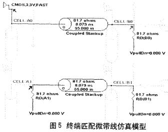 微带线模型参数设置如下:走线宽度为6 mil,间距为4 mil ,走线距下方参考平面的高度是10 mil,相对介电系数为4.3,驱动器为“CMOS 3.3V FAST”,微带线的长度为55in。完成设置后,HyperLynx计算出微带线的特征阻抗Z0为81.7ohms,传输延迟Tp为8.079ns。建立的仿真模型如图3所示,仿真结果如图4所示。