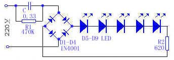 该灯的内部接线如下图所示。电容C将220V市电降压,经二极管D1-D4整流后供给发光二极管D5-D9发光。发光二极管应采用发绿色光的,因为绿色能让人安静、放松。