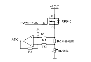 IRF540的G极接PWM波转换后的直流电压,D极接能提供15V/5A电流的电源(可采用开关电源),S极用来接采样电阻和负载。采样电阻应采用温漂系数低、阻值为10mΩ、精度为1%的大功率锰铜丝电阻。当对采样电阻两端信号进行差分后,可得到采样电阻两端的电压值U,而在已知采样电阻阻值情况下,很容易得到流经采样电阻的电流,即I=U/R。由于负载与采样电阻在同一条支路,故流经负载的电流也为I。差分放大电路的放大倍数可根据采样电阻阻值以及ADC的参考电压来选择,图5中要求R1=R3,R2=R4,放大倍数为R4/R3。需要注意的是该电路应该具有很高的输入阻抗,以减少对负载电路的影响。差分信号经ADC口送入单片机进行处理。