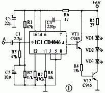 接收与发射电路中两只CD4046的中心频率均为45kHz,故R7与R17、R8与R18、C4与C24的参数必须严格对应相等。驱动红外发光管的三极管VT1与VT2均工作在放大状态,其Vbe约0.6V;VT1与VT2也可用9013替换,但管子的β应大于100。发射电路的电源在图中没有标出,制作时可用LM7806稳压后获得。