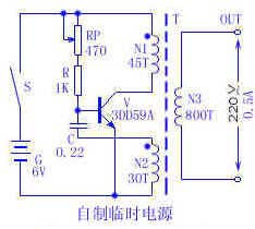V选用3DD59A,R用1/4W的普通电阻,C选用0.22μF/50V,变压器需自制,N1、N2绕组用?0.9mm的漆包线,N3绕组用?0.67mm的漆包线,绕组框架可用1mm厚的硬纸板制作,磁芯最好用铁氧体U型或环型,如没有,就用普通E型或F型硅钢片代替,直流电流G用6V蓄电池。