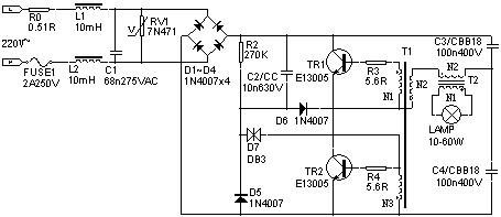 卤素灯又称石英灯,它具有聚光性好、亮度高、显色性好、外形新颖和寿命长等优点,广泛应用于舞厅、宾馆和商场等场所做局部照明。由于普通石英灯使用12V电压,在使用时需要配备电源变压器,传统使用的工频变压器因效率低、体积重量大而逐渐减少使用。近年来,电子变压器以其高效率、小体积等优势已被大量应用于低压石英灯照明场合。本文介绍一种在国内应用较多、整机性能指标较好的电子变压器电路。