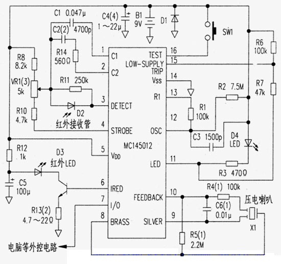 火灾报警器集成电路MC145012集成了报警器的全部功能,只要外接红外线发射、接收元件及喇叭等,就可构成一台火灾报警器,而且还可以与电脑连接构成报警系统。
