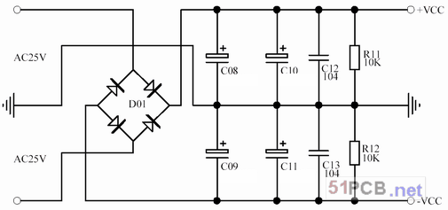 为了保证功放板的音质,电源变压器的输出功率不得低于80W,输出电压为2*25V,滤波电容采用2个2200UF/25V电解电容并联,正负电源共用4个2200UF/25V的电容,两个104的独石电容是高频滤波电容,有利于放大器的音质。