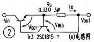 在图1的电路中,电路没有过流保护的功能,当输出端出现短路时输入的15V电压将全部加在Tr1上,导致Tr1瞬间被烧毁。图2(a)是过流保护电路。在Tr1的发射极电路中增加一个串联电阻Rs和一个小功率三极管Tr3,就可以在电路的输出端出现短路时,对Tr1上流过的电流加以限制。在正常工作时由于Rs电阻上的电压降很小,所以Tr3截止。在电路的输出电流增大时,RS电阻上的电压降也随之增加,当RS电阻上电压降(Tr3的VBE3)超过0.65V时,Tr3导通,Tr3的VCE变小。Tr1的VBE1也随之变小,于是流过Tr1的输出电流就会被限定在某一个设定的值。在该电路中电流的限定值为0.65V/Rs≈2A。另外图2(a)的电路还可以用作发光二极管的恒流源电路。应用时将图2(a)电路的输出端接地,Tr1的集电极与发光二极管相连接。图2(b)是该电路的限流特性。