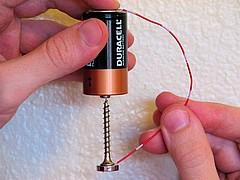 先把铁钉和磁铁连起来,并把它一头吸在电池的一极上,正负都可以,只是最后旋转的方法相反而已。然后要用电线把电池和铁钉尾段的磁铁连接起来,即慢慢地用电线碰几下磁铁,铁钉就开始加速旋转。据测量只要15秒就可以使铁钉加速到1万转每分钟!(需垂直放置,建议磁铁大一点,重量抵消磁力后,可以使铁钉和电池接触点的摩擦力最小化)