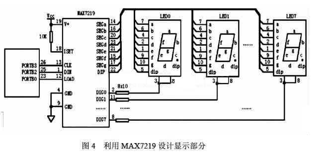 如图 4所示,系统的显示是使用 MAX7219实现的 8位稳定静态显示,MAX7219是串行共阴极数码管动态扫描显示驱动芯片,仅使用 3线串行接口传送数据,可直接与单片机接口,用户还可以方便地修改其内部参数以实现多位 LED显示,因此可以方便地使用单片机的串口送出显示数据,并且其占用的时间少,方便编程及对信号的检测。