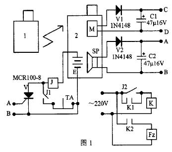 电路见图1。由图1可以看出,主叫手机1或办公室的电话机拨打被叫手机2,被叫手机振铃,我们就取它的振铃信号作为本电路的启动信号。这个振铃信号既可取自被叫手机的听筒喇叭SP两端A、B点,又可取自手机中振动电机M的电源两端C、D点,本文取自听筒喇叭两端。当被叫手机振铃后,经二极管V2整流电容C2滤波后驱动可控硅V导通,继电器J得电吸合,它的一对常开接点J1闭合,实现自保持。同时另一对常开接点J2闭合,接通交流接触器线圈220V电源,接触器K得电吸合,其常开触头K1闭合,实现自保持,同时另一对常开触头K2闭合,接通家用电器F2电源,实现被遥控家电工作。增加接触器的目的是可遥控大功率的家电。如电取暖器、电饭锅、空调等。这些电器在下班前15分钟遥控接通电源,回家后就可以使用,节省午休时间。若遥控的是小功率的家电,如电灯等,则不需要加装交流接触器,直接用本电路的继电器常开接点J2即可。要想切断被遥控家电的电源,只要按下本电路的停止按钮TA电路即可复位。