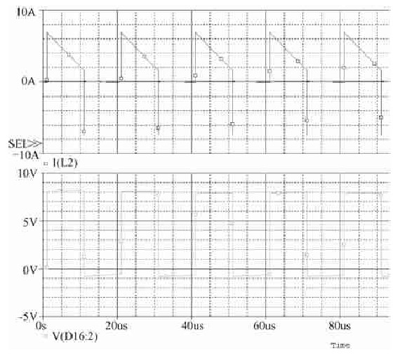 图4 Mos 管电流波形和门极驱动电压波形的Pspice 仿真结果