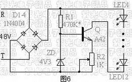 电路见图4。优点是成本最低,体积最小,但效率低,相当多的电能都消耗在电阻上,本电路最适宜做成小电流的小夜灯或指示灯之类的,管子的数量在1到8只之间串联,对电路的电流影响不大。图4电路的电流约4mA,用它作长明的小夜灯,总消耗功率也不足1W,还是比较实用的。
