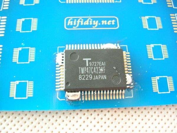 然后使用融化的焊丝,随意焊接IC的数个脚来固定IC