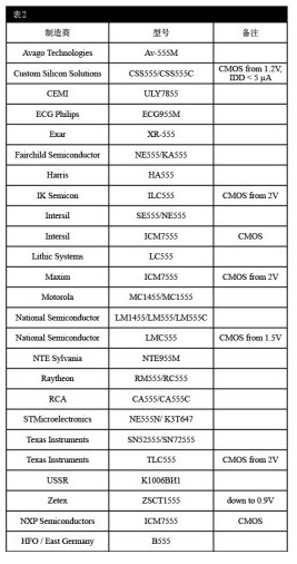 表2总结了各大芯片制造商生产的众多型号,引脚兼容的555时基集成电路,包括CMOS版本,方便电子爱好者查阅。