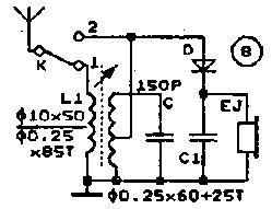 但天线要加长到50米,机内连线加粗到Φ2mm。可变电容是串联的,线圈L1套入L2调节。180PF可变电容为360PF双连拆去其中一联动片得到。