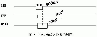 单字节串并模块在IBF信号为'1'(表示计算机空闲,可以接收数据)时接收一个串行字节,再以并行方式在STB下降沿输出到并口卡。测得计算机上的8255并口卡输入数据的时序如图3: