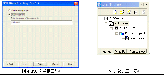 搭建电路时,当将单片机U1放入电路图中时,会出现MCU向导,如图2所示。第一步,分别输入工作区路径和工作区名称。工作区名称任意,这里输入MCUCosimWS。第二步,如图3所示,在项目类型(Project type)下拉框有两个选项:标准(Standard)和加载外部Hex文件(Load External Hex File),你可以在Keil等环境下编写汇编和C源程序,然后生成Hex文件,再通过“加载外部Hex文件”导入。限于篇幅这里选标准(Standard),接着在“编程语言”(Programming language)下拉框里会有两个选项:C和汇编(Assembly),如果选择C,则在汇编器/编译器工具(Assembler/Compiler tool)下拉框会出现Hi-Tech C51-Lite compiler,我们这里选择汇编(Assembly),则出现8051/8052 Metalink assembler。接下来在项目名称(Project name)里输入名称,如CosimProject。第三步,如图4所示,对话框里有两个选项:创建空项目(Create empty project)和添加源文件(Add source file)。选择添加源文件,点击完成。保存文件,键入M10Cosim作为文件名,然后查看“设计工具箱”(Design Toolbox),应如图5所示。