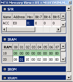 选择菜单MCU→MCU 8051 U1→Debug View,可以看到文本区上面有下拉菜单并有两种选择,对应反汇编(disassembly)和列表汇编(listing assembly),简单的说,前者是由ROM的内容得到,后者是源文件编译后的结果。双击“设计工具箱”的main.asm,在源文件编辑窗口右键单击语句为“MOVC A,@A+DPTR”的一行,选择“设置/清除断点”(Toggle Breakpoint),在左侧会出现一个实心圆,点击“运行”,程序将停在该行,只不过是在“调试视图”(Debug View)的列表汇编窗口下,同时在实心圆上多出了一个黄色箭头。点击MCU-> MCU 8051 U1->Memory View,打开MCU存储器视图,在该视图可以查看特殊函数寄存器(SFR),内部RAM(IRAM),内部ROM(IROM),外部RAM(XRAM)。在SFR表格内观察ACC的值,此时应该为“00”,在IRAM里观察地址为21H的值,因为“MOV SP,#20H”语句将21H作为堆栈的第一个存储字节的地址,断点的前一处语句“PUSH ACC”使该字节存储ACC的值,此时也为“00”。再点“运行”,程序第二次停在断点处,观察SFR中的ACC和IRAM中的21H,如图9所示应,两个单元格里的值都应为“01”,你还可以双击该单元格进行修改,该值也正是七段数码管即将显示的下一个数。点击MCU菜单,可以看到除了设置断点以外还可单步进入(Step into),遇到函数时进入函数内部;跳过(Step over),即不进入函数;跳出(Step out),即跳出函数到调用函数的下一条语句。