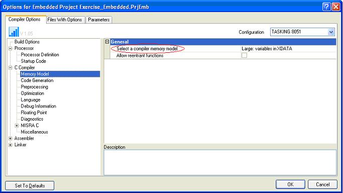 3、点击C Complier,选择Memory Model并且在Select a complier memery model属性栏中将下拉选择Small:variables in DATA,然后确定Allow reentrant functions属性未被选中。(图3.2)