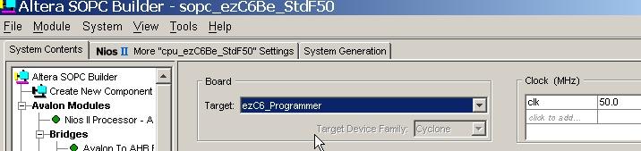 ezNiosC3的用户如下操作:Board Target 选择:ezC3_Programmer,clk选择 64.0