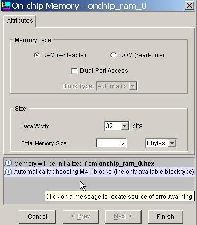 双击左边的Memory -> On-Chip Memory,为系统添加2K byte onchip RAM,按照如下配置。我把它改名为onchip_ram_0,您可以依据需要,为其命名。