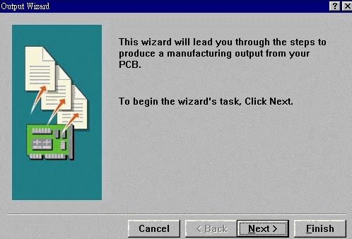进入 {Output Wizard}视窗,你可以依Wizard的指引,一步一步的设定,输出Gerber File,在这里我们点选 [Finish按钮,离开 {Output Wizard}视窗。