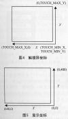 if(dlXDiff0 if(dlXDiff2 tmx=((px[0]+px[2]>>1); } else{ tmx=((px[0]+px[1])>>1); } } else if(dlXDiff2 tmx=((px[0]+px[2])>>1); } else{ tmx=((px[1]+px[2])>>1); } 函数Touch_Coordinate Conversion完成触摸屏采样值转换成显示坐标,根据不同的硬件有不同的转换方法。本触摸屏采样坐标及显示坐标如图4、图5所示。其中 TOUCH_MAX_X和TOUCH_MIN_X是触摸屏X坐标采样值的最大和最小值;Y坐标同理。可以运行本文程序,同时使用触摸笔在触摸屏的4个角取得最大最小采样值。这里使用的是320×240的TFT屏,所以TOUCH_X值为320。下面是X坐标的转换程序: Touch_CoordinateConversio(int*px){ TmpX=(tmx>=TOUCH_MAX_X)?(TOUCH_MAX_X):*px; TmpX-=TOUCH_MIN_X; TmpX=(TmpX)?TmpX:0; *px=(TmpX*TOUCH_X)/(TOUCH_MAX_X-TOUCH_MIN_X); } 3.3 坐标滤波程序 坐标滤波程序Touch_Pen_filtering,考虑人机界面中对触摸屏的操作有3种: *触摸笔在触摸屏上的位置不变; *触摸笔在触摸屏上连续滑过; *触摸笔在触摸屏上有大幅度的跳跃。 假设三次连续采样时刻为T1、T2、T3(T3> T2>T1),采样间隔为 10ms。由于采样间隔远小于人的反应时间,所以在前两种操作模式下,如果采样点有效,将T1和T3时刻的采样值作平均。其平均值和T2时刻的采样值比较一般不会大于某个门限,否则判定此次采样点为野点。而对于第三种模式下,采样点数据会有很大的跳变。跳变过程中的数据是不稳定的,虽然记入了数据,但被判定成无效的采样点,所以需要在程序中定义一个静态数组x[2]记录相邻的两次采样数据。只有当前后数据持续稳定一段时间,才认为这时的采样点有效。程序中使用的间隔门限FILTER_LIMIT是需要经过试验来选取的。这里只给出X坐标的滤波过程。 //*px为T3时刻的采样值,count是记录连续有效采样点次数的静态变量,标志当前数据持续稳定时间,一旦发现大于//FILTER_LIMIT,count的值又要从0开始计数。 Int Touch_Pen_filtering(int *px){ BOOL retVal; Static int count=0; count++; //如果连续有效采样点次数大于2次,开始进行滤波算法 if(count>2){ count=2; //将T3时刻采样值和T1时刻采样值作平均 TmpX=(x[0]+*px)/2; //计算平均值和T2时刻采样值的差值 dx=(x[1]>TmpX)?(x[1]-TmpX):(TmpX-x[1]); //如果差值大于门限值,说明T3的采样值无效,判为野点返回值为FALSE。为了避免过大的跳跃,认为触摸笔坐标沿变,使用T2时刻采样值来代替本次采样点,同时静态变量x[]中的数据不变,count重新开始记录连续有效采样点次数 if((dx>FIL TER_LIMIT)){ *px=x[1]; retVal=FLASE; count=0; } //否则采样点有效返回值为TRUE,将T3的采样点记入到x[1]中,T2的采样点移到x[0]中 else{ x[0]=x[1]; x[1]=*px; retVal=TRUE; } } else{ //连续有效采样次数小于2,将T3的采样值记入到x[1],T2的采样值移动到x[0],并不进行滤波处理 x[0]=x[1]; x[1]=*px; retVal=FLASE; } return retVal; } 3.4 后续处理 经过上述的筛选和滤波,如果被判定采样值有效,则将其滤波值送给操作系统进行后续处理,否则程序返回,等待下一次采样。在2410 test程序中,可以结合LCD的画点函数,将有效的采样点在LCD上画出,以此检验参数设置是否合理。 结语 本文以三星公司ARM9内核芯片S3C2410和4线电阻式触摸屏为硬件基础。基于此硬件结构,开发了触摸屏画图板程序。通过软件滤波,提高了系统性能,得到了很好的处理效果,有很强的实用性。用此算法实现的 Windows CE触摸屏驱动,在汉王手写输入软件的测试下得到了很高的识别率。软件使用C语言实现,可以方便地移植到任何操作系统上。 点击查看大图