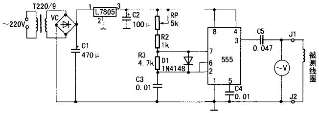 测试时,测试器的两个输出端J1、J2分别接被测电感的两端。被测线圈的电感L与输出耦合电容C5组成串联电路。调节RP,当输出方波脉冲的频率等于LC串联电路的固有频率时,电压表的示数最大。如果被测线圈的电感量较大(如彩色电视机的“FBT”初级线圈的电感为3.26mH),绕组无匝间短路时。电压表的示数可达30V。若用示波器测量线圈两端为一幅度为80Vpp。周期为80us(频率为12.5kHz)的正弦波。如果被测线圈的电感量较小(如行推动变压器的次级线圈为0.427mH),电压表的最大示数为16V。用示波器测量为35Vpp周期为30 us的正弦波。