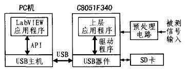 系统设计框图如图1所示,整个系统由PC机和C8051F340数据采集模块组成。PC机部分主要是软件设计,包括LabVIEW 软件编写的数据采集图形用户界面和C8051F340单片机片上USB主机API,负责接收、显示和处理由数据采集模块通过USB接口发送的采集数据。而数据采集模块主要由C8051F340处理器、预处理电路和SD卡构成,负责通过C8051F340片上D/A采集经预处理电路的被测信号,再将采集信号存储至SD卡,并经USB总线传输给PC机显示。另外,LabVIEW 应用程序和C8051F340应用程序均是采用Silicon Laboratories公司提供的USBXpress开发套件的API和驱动程序来实现对底层USB器件的读写操作。