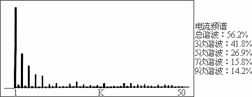 图10 给出了在空载恶劣条件下,实际测量打印的48V、70A 通信电源市电输入电流波形,和最敏感变坏的电流谐波与功率因数值:输入电流波形变为尖窄脉冲、且相位明显偏离输入电压的正弦波相位;总电流谐波高达56.2%(3 次谐波为41.9%,5 次为26.9%,7 次15.8%,9 次14.2%等);功率因数值剧降到0.456,比350V 特种电源空载时的PF=0.859 差了许多(它的电流总谐波仅21.5%、3 次谐波14.6%,5 次为10.5%,7 次5.2%,9 次1.9%等)。