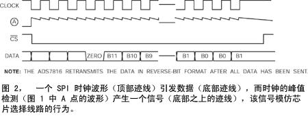 当时钟线路变为低电平时,它还使CS保持低电平状态。峰值检测器(由D1、R1、C1组成)的时间常数确保了CS不会变为高电平,直到时钟线路保持高电平的持续时间超过一个时钟周期(图2)。虽然时钟线路转换并从 IC2取回数据,但CS保持为低电平,并且,在数据取回任务完成时,时钟线路变为高电平,CS随后也变为高电平,使电路为另一个转换周期准备就绪。