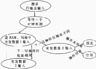 根据输入命令,SDRAM状态在内部状态间转移。内部状态包括:①模式寄存器设置状态;②激活状态;③预充状态;④写状态;⑤读状态;⑥自动刷新状态;⑦自我刷新状态;⑧节电状态。