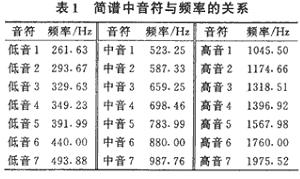 乐曲的12平均率规定:每 2 个八度音(如简谱中的中音 1 与高音 1)之间的频率相差 1 倍。在2 个八度音之间,又可分为12个半音,每2个半音的频率比为12√2。另外,音符A(简谱中的低音6)的频率为440Hz,音符 B 到C之间、E 到F之间为半音,其余为全音。由此可以计算出简谱中从低音 l 至高音1 之间每个音符的频率,如表 1 所示。