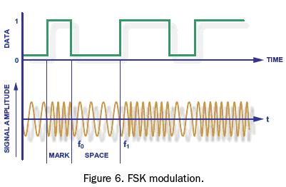 二进制频率转换键控(通常简化为FSK)是数据编码的最简单形式之一。数据由转换连续载波频率去一个或者两个离散的频率(所以二进制),一个频率f1(也许是较高的那个)指定为标志频率(二进制的位1),而另一个频率f0,作为space frequency(二进制的位0),图六举出了脉冲间隔数据和转换信号之间的关系。