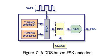 用DDS实现编码方案很容易实现。DDS的频率调谐命令,设置适当的值当它们发生在模式0和1即将传送时去产生fo和f1,体现在输出频率上。在传送之前用户可以编程两个必需的调谐命令到设备,当用AD9834时,两个频率寄存器去产生方便的FSK代码是可行的。IC上一个专门的引脚(FSELECT)接收调制信号选择适当的调谐命令(或者频率寄存器)。图七展示了简单的FSK编码的执行: