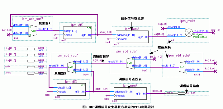图2给出了DDS调制信号发生器核心单元的FPGA电路设计图。其设计方案采用ALTERA公司的Cyclone系列EP1C6T144C6芯片,加法器为12位,调制信号波形存储器为4096×12BIT,载波信号波形存储器为4096×12BIT,系统时钟为80MHz;设计性能参数:载波频率可达10MHz(为确保波形不失真,一周期至少取8点),调制频率范围0~100K,调频深度0~10。外部电路输入有调制信号频率控制字Kh[11..0],载波信号频率控制字Kc[11..0],频偏控制字Kx[11..0],调制信号系统时钟TZCLK,载波信号系统时钟ZBCLK。Kh[11..0]经累加器A输出累加相位ADDA[11..0]作为调制信号查找表的地址,波形数据Qa[11..0]和Kx[11..0]和Kc[11..0]经过数值变换后输出调频控制字K[11..0]。K[11..0]经累加器B输出累加相位ADDB[11..0]作为调频信号查找表的地址,波形数据Qb[11..0]经外部DAC转换和低通滤波得到调频信号波形。其中,在两个累加器后相连的DFF缓冲器有助于消除毛刺的影响,进一步确保系统的稳定性和可靠性。