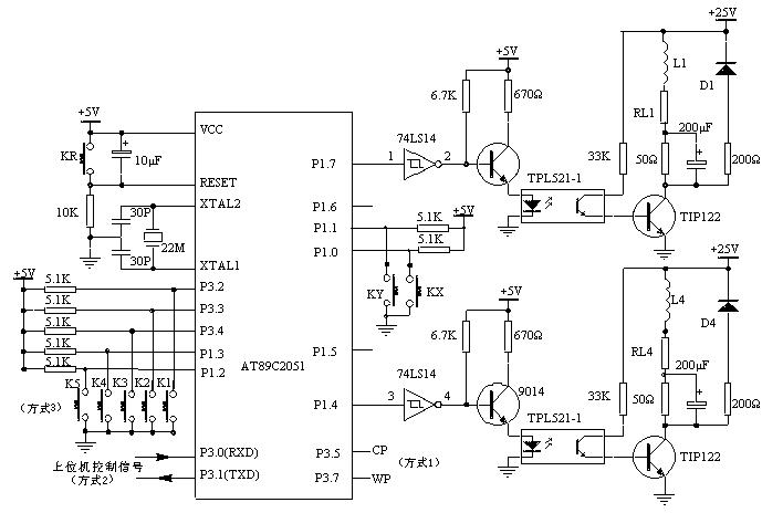 AT89C2051将控制脉冲从P1口的P1.4~P1.7输出,经74LS14反相后进入9014,经9014放大后控制光电开关,光电隔离后,由功率管TIP122将脉冲信号进行电压和电流放大,驱动步进电机的各相绕组。使步进电机随着不同的脉冲信号分别作正转、反转、加速、减速和停止等动作。图中L1为步进电机的一相绕组。AT89C2051选用频率22MHz的晶振,选用较高晶振的目的是为了在方式2下尽量减小AT89C2051对上位机脉冲信号周期的影响。