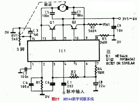 数字伺服电机控制单元,可以买到现成的集成电路。例如ZN409CE或NE544N型伺服电机放大器集成电路。图26和图27示出了这两种集成电路的典型应用。