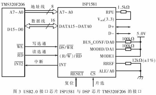 在数据转存系统中,ISP1581用于处理主机的高速数据传输。它工作在普通处理器接口模式下,采用8051风格的读写选通信号,由DSP芯片TMS320F206控制。两者在选定工作方式下的信号连线如图3所示,图中未画出的信号引脚可以悬空,供电引脚的连接方式在参考资料[2]第46页有简明描述。在FPGA译码逻辑的作用下,ISP1581的片内寄存器被映射在DSP的片外数据空间中。DSP通过8位地址线选择要访问的寄存器,在读写选通信号的控制下,利用16 位数据线与选定的寄存器交换数据。在访问ISP1581单字节寄存器时,数据总线高字节内容无关紧要。ISP1581通过中断引脚INT向DSP报告发生的总线事件,利用D+、D-引脚完成与主机的数据交换。