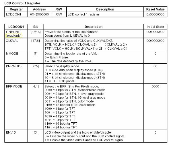 - CLKVAL--- 这可是一个很有用的参数,其实没必要管它后面的计算,我们可以通过实际的测试来得出一个有效的值,对于320x240 的屏一般设置为 7 就可以了,而对于 640x480 的屏,该值可以小一点。对于后面的计算公式及注释(STN: CLKVAL >= 2,TFT: CLKVAL >= 0),我不知道该如何去理解,因为在实际的应用中我点了一块 640X240 的CSTN 屏,当我的 CLKVAL = 1 时才达到了一个最佳的效果,这似乎与说明书相违背,我也解释不清为什么?!