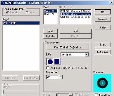 Antipad 设置也有两种形状,但下面只有一个 diameter 的项目,这里设置为 72 表示的是隔离圈的直径为 72mil,因为孔径是 32,所以
