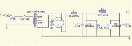 电源方面决定采用传统的电子管全波整流加CLC滤波的方式。电子管全波整流是指用一支双二极管来把两个极性相反的正弦交流电压变成直流电;而后面的CLC滤波是指使用并联的电容和串连的铁芯电感(即扼流圈)来将直流电压的纹波尽量抹平。