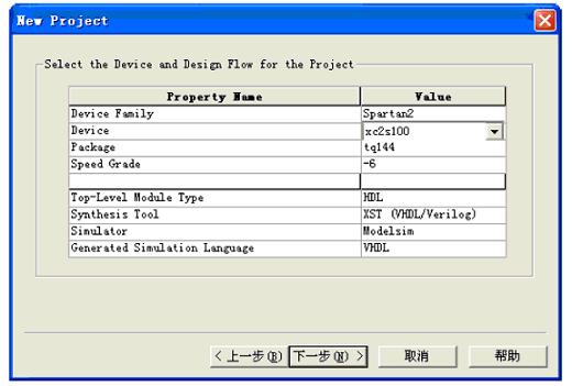 Step3. 单击“下一步”,出现如图3 所示的窗口,在该窗口中来选择设计实现时所用的器件。在包含FPGA 的PCB 板子做出来以前,我们选择不同类型的FPGA 进行测试,看看FPGA 的资源是否够用,在PCB 板子做出来以后,我们在这里的选择与PCB板上的FPGA 必须一致。否则生成的下载文件无法配置到FPGA 中。此处若选择错了,也没有关系,因为后面可以随时修改这些设置。其中DeviceFamily 表示目标器件的类型;Device 表示目标器件的具体型号;Package 表示器件的封装;SpeedGrade 表示器件的速度等级。这里我们选择器件为Spartan2E,xc2s100,tq144,-6。其中xc2s100中的100 表示器件为10 万门,tq144 表示器件有144 个管脚。