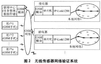如图2所示,无线传感器网络验证系统主要由数据采集和传输网络(本地网络)、GSM网络、管理中心、用户终端4部分组成,其中,用户终端就是普通的手机,它和GSM网络都是非常成熟的稳定的平台,因此验证的主要研究工作在管理中心和本地网络的设计实现以及如何接入GSM网络。