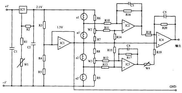 这种传感器阻抗较低,电压变动会引起特性变化,因此,使用了稳压集成块和稳压电路。这个电路由于同时还检测到水蒸气和二氧化碳以外的其他气体,而不能获得真正的二氧化碳信号,所以要对两个传感器施加不同的电压,并取出两者输出之差值,以此抵消由二氧化碳以外的气体产生的输出。在本电路中,两个传感器串联连接,分别施加了0.5V和1.3V的电压。其输出经由运算放大器放大,并作相减运算,从而获得真正的二氧化碳的信号。在这种放大电路中,传感器的输出很小,当二氧化碳浓度为10%时,输出大约为3mV,所以很容易受噪声影响,因此要注意线路的设计和器件的选择。C3、C4、C5用于消除噪声,W1用于调整电压,W2、W3用于将传感器在空气中的输出调整到零,而W4则用于调节两运算放大器的放大率。